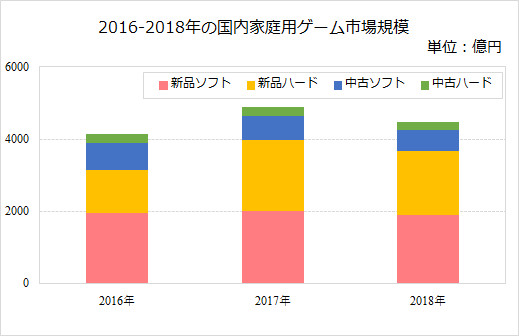 もう一つ多くの人が気になっているであろうことが最新の状況である。2019年のファミ通ゲーム白書をまだ見れていないため2018年のデータがなかったが、その点は『2019ゲーム産業白書』で補うことができた。ひとまず3年分の市場規模を記してみよう。